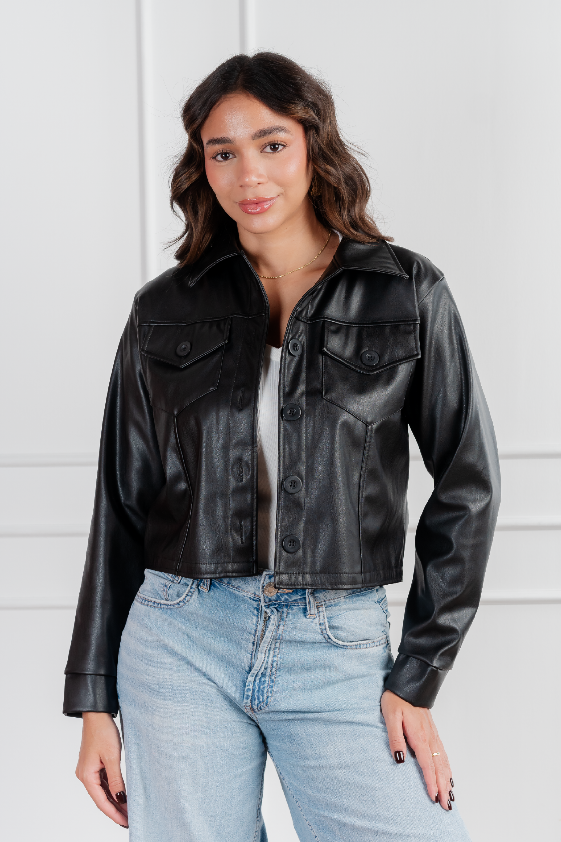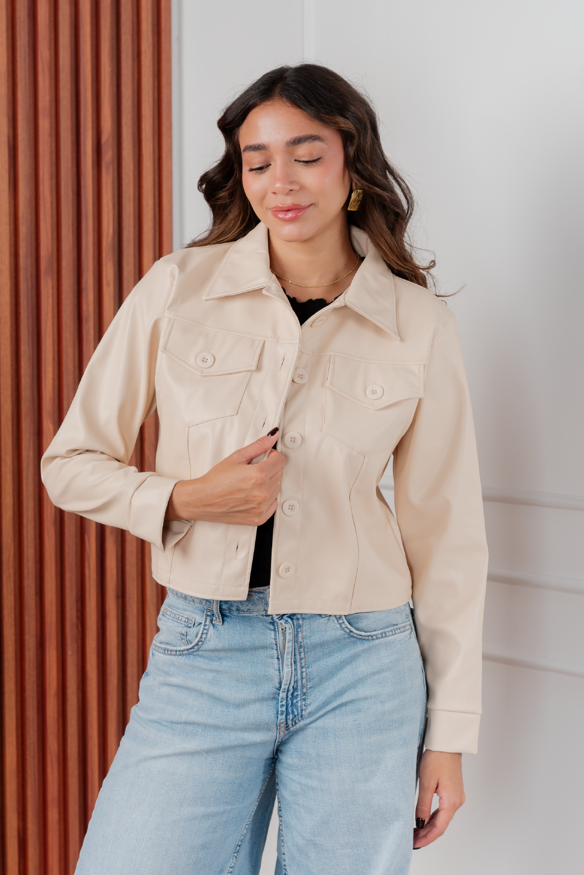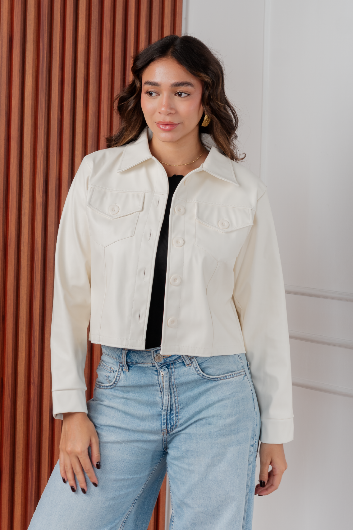 Chaqueta tipo biker de cuerina con un acabado impecable con bolsillos delanteros y corte recto. Un básico moderno y versátil que eleva cualquier look casual. Producción (Confección) 100% Peruana Tela Cuerina Nikol mide 1.68 Busto 90 Cintura 67 cm Cadera 102 cm y usa la talla S/M y Lucero mide 1.61 Busto 93 cm Cintura 79 cm Cadera 107 cm y usa la talla S/M