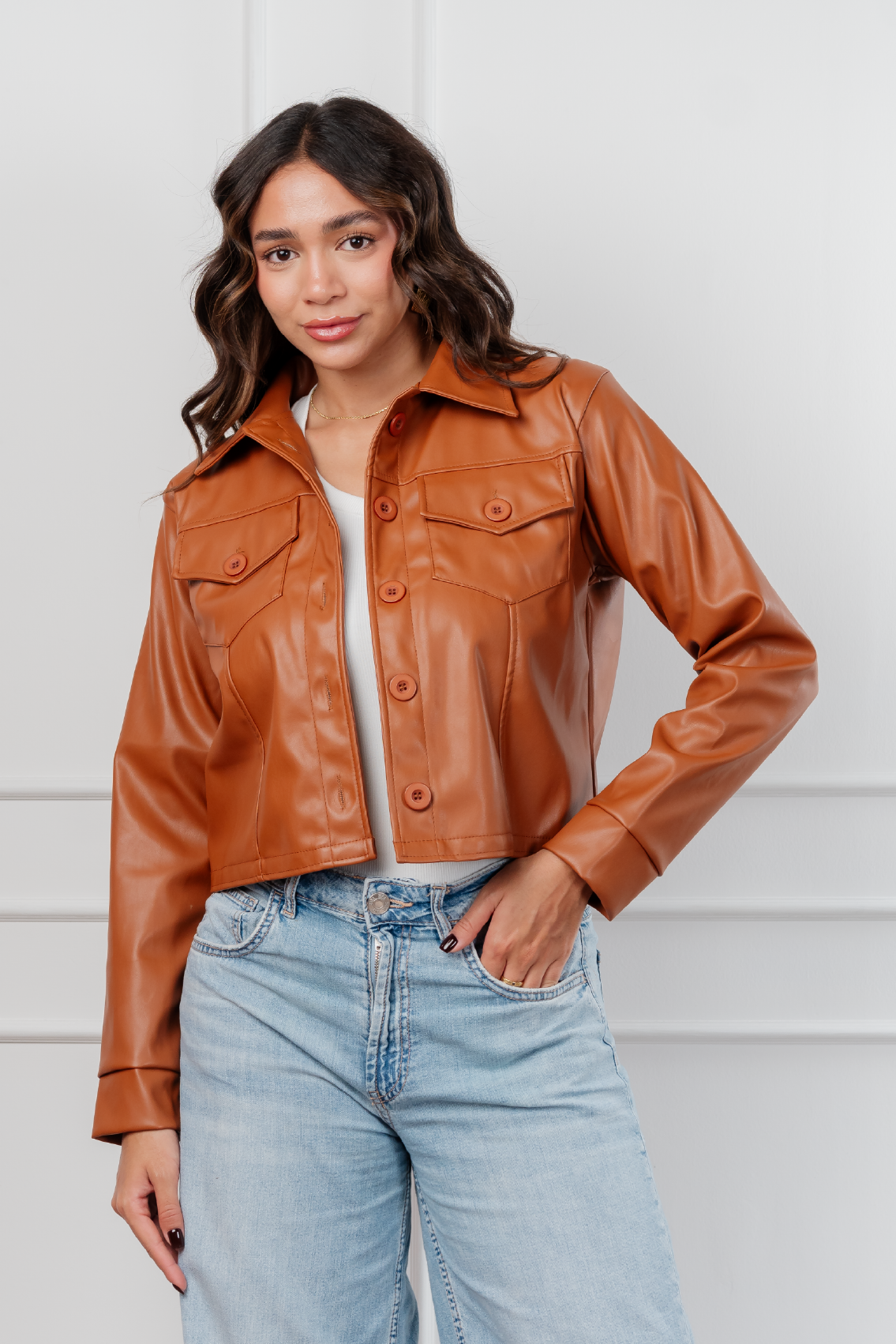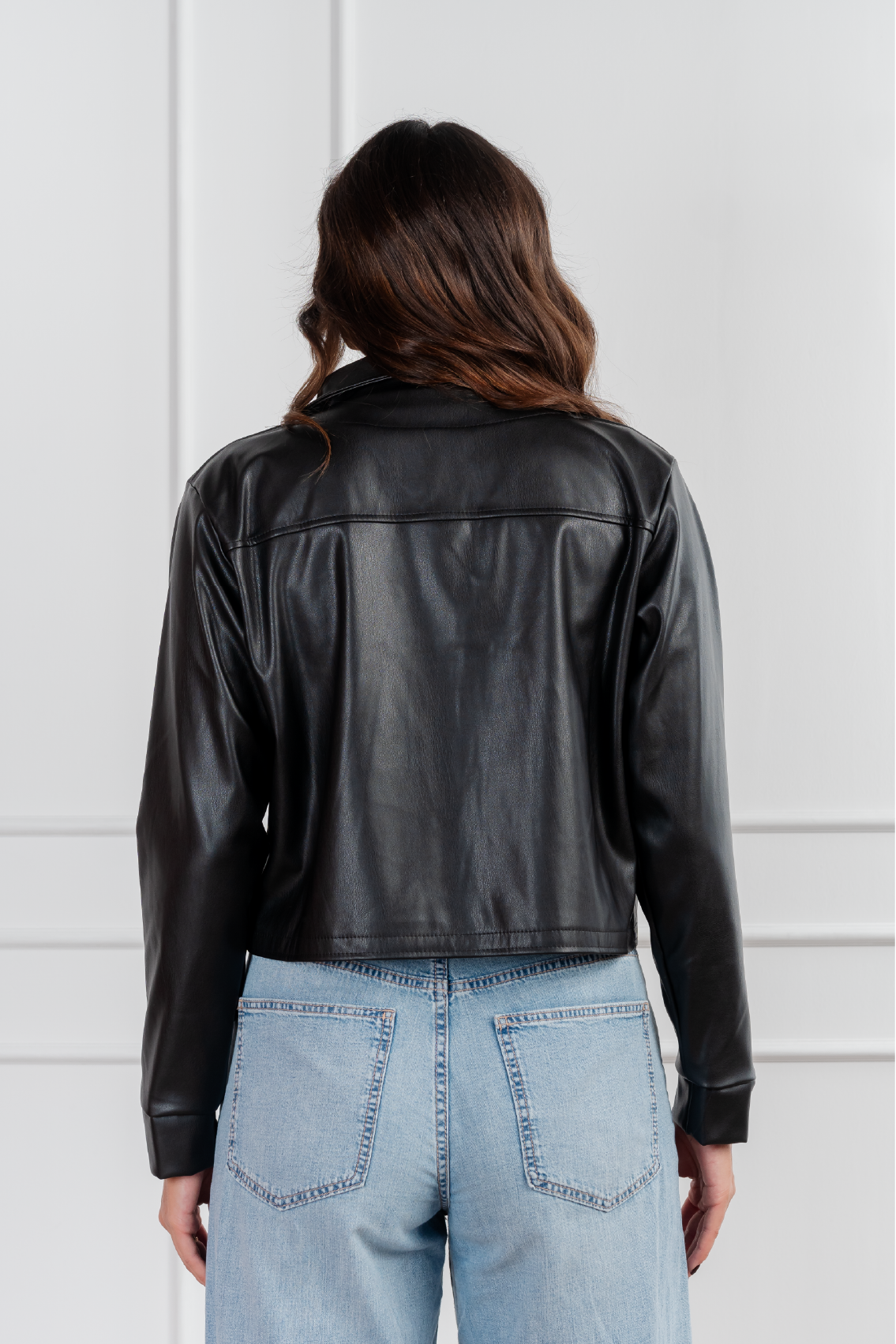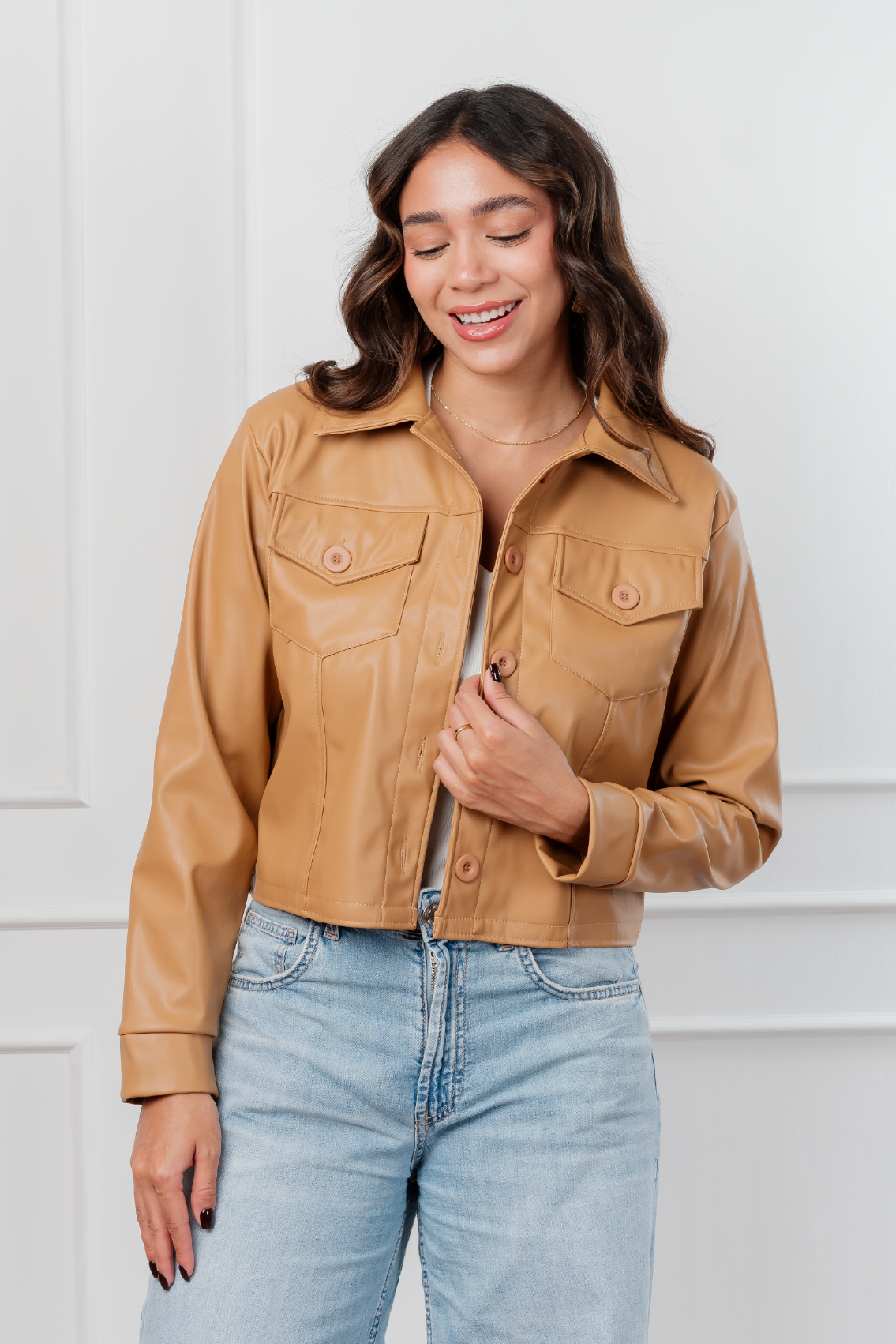 Chaqueta tipo biker de cuerina con un acabado impecable con bolsillos delanteros y corte recto. Un básico moderno y versátil que eleva cualquier look casual. Producción (Confección) 100% Peruana Tela Cuerina Nikol mide 1.68 Busto 90 Cintura 67 cm Cadera 102 cm y usa la talla S/M y Lucero mide 1.61 Busto 93 cm Cintura 79 cm Cadera 107 cm y usa la talla S/M