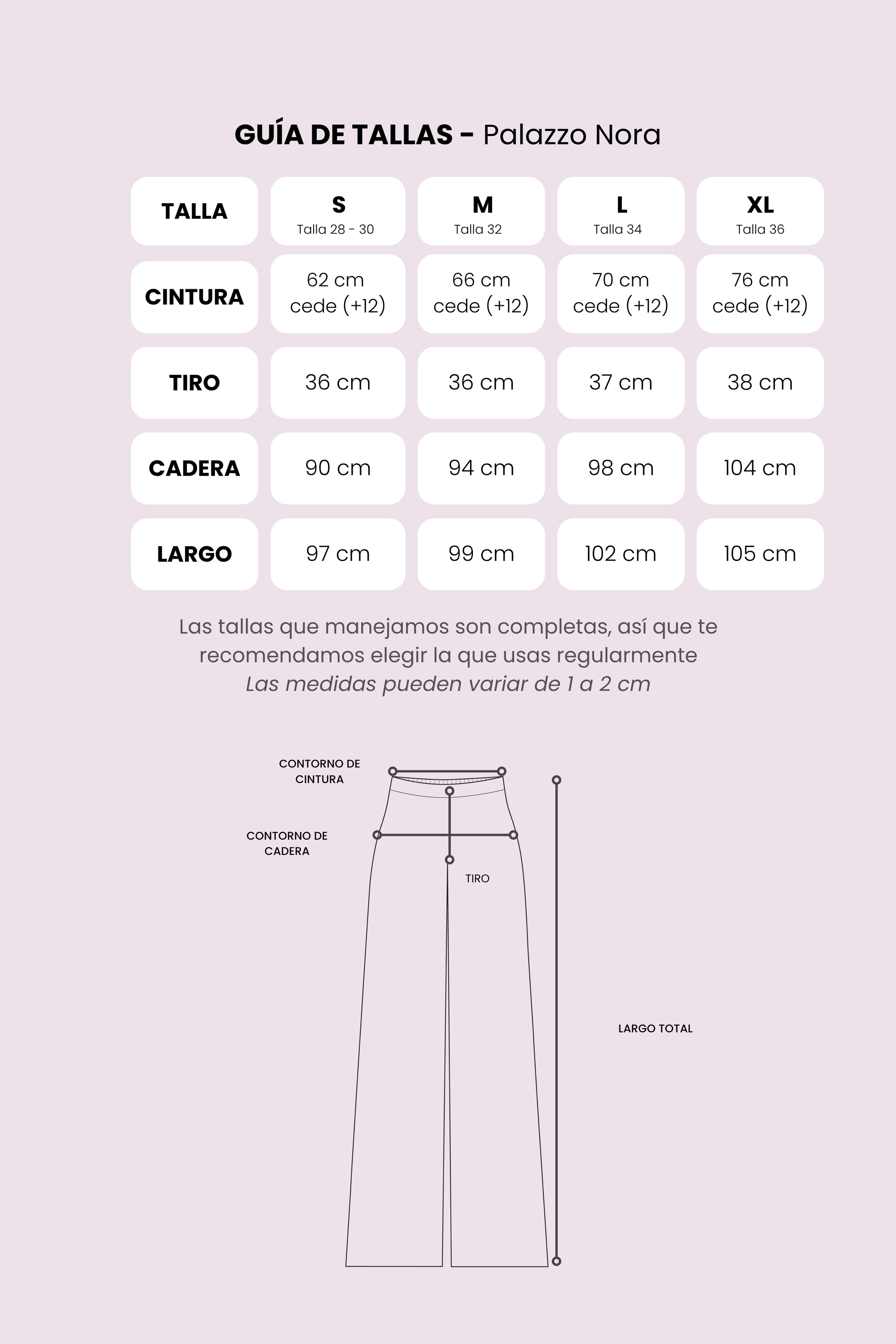 Cada producto cuenta con una tabla de medidas en formato de imagen, la cual encontrarás al final de la galería de fotos de cada producto. Además, en la descripción del producto detallamos las medidas, la altura de la modelo y la talla que utiliza, para que tengas una mejor referencia.