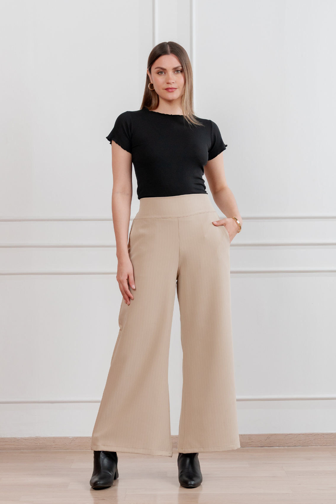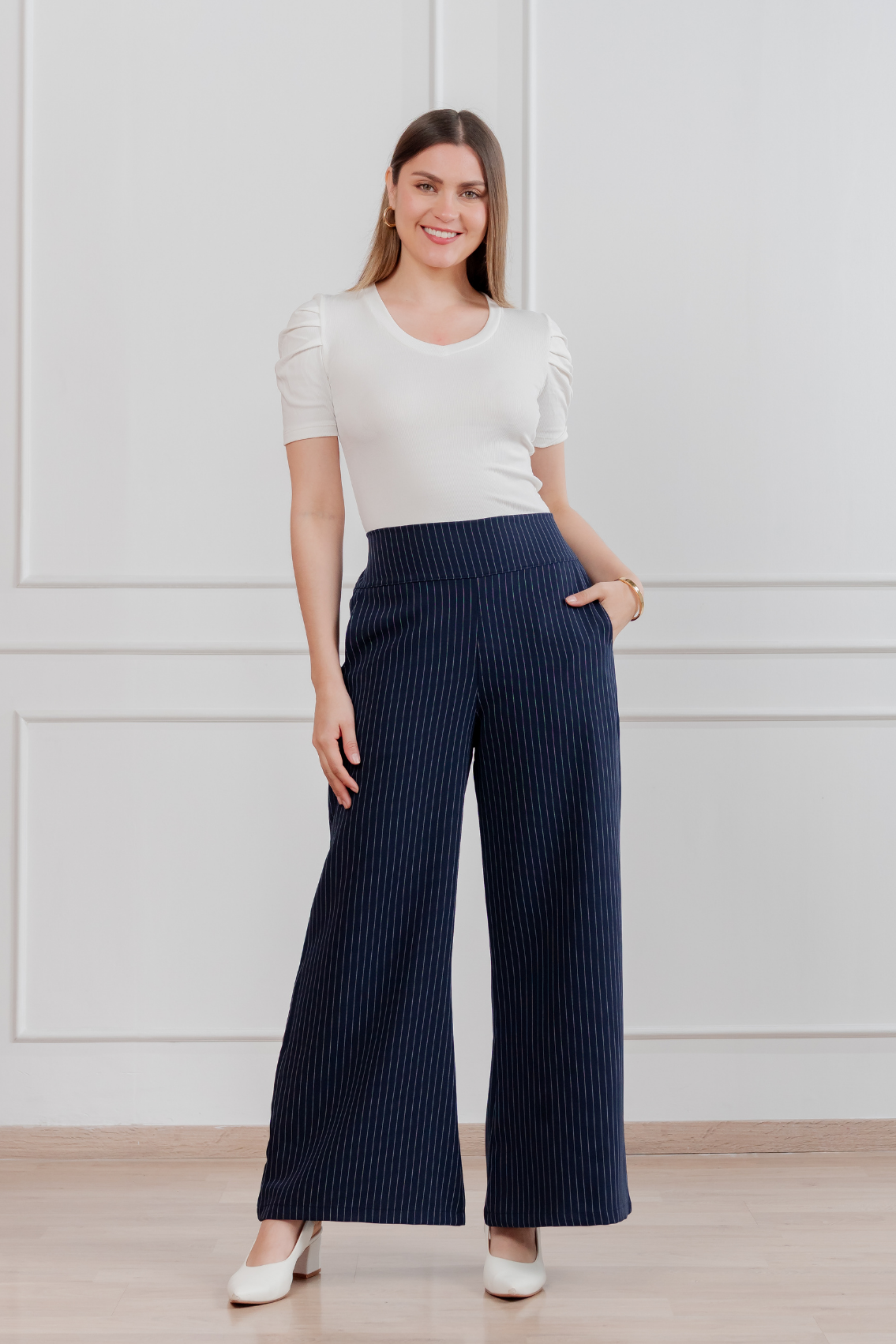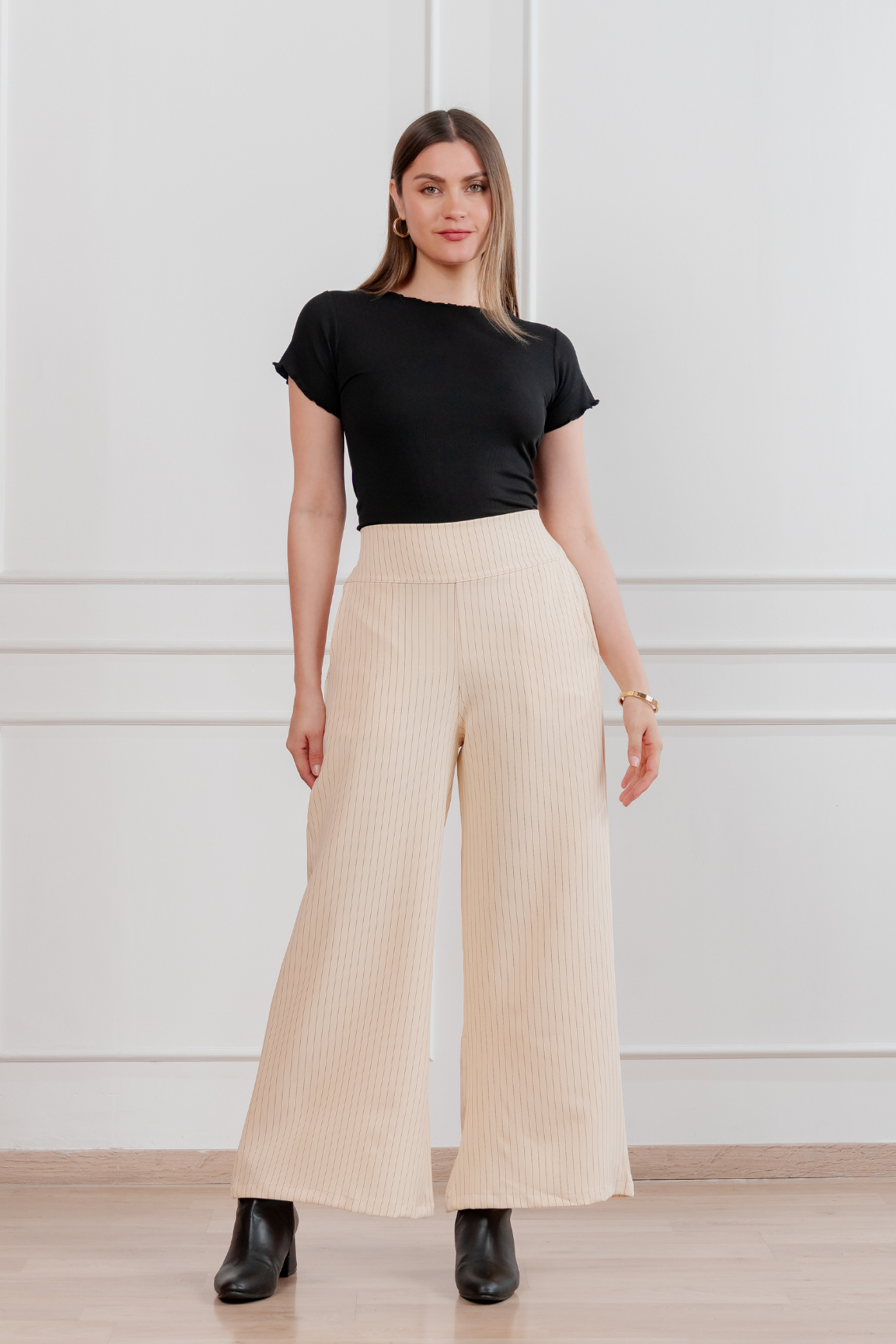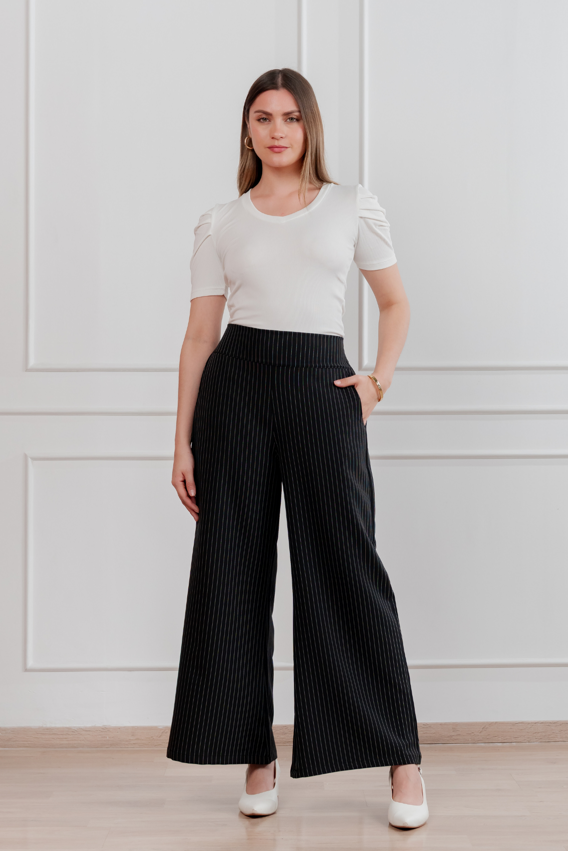 Pantalón palazzo de corte amplio con estampado de rayas verticales que estiliza visualmente la figura. Pretina alta para realzar la cintura y caída fluida para máxima comodidad y elegancia. Regular fit Tela:Catania con diseño de rayas Confección:100% peruana