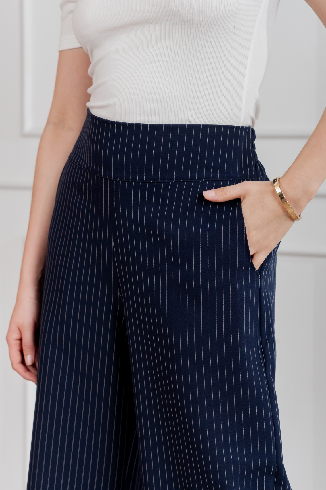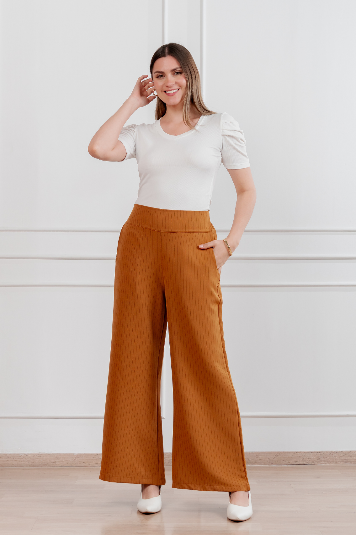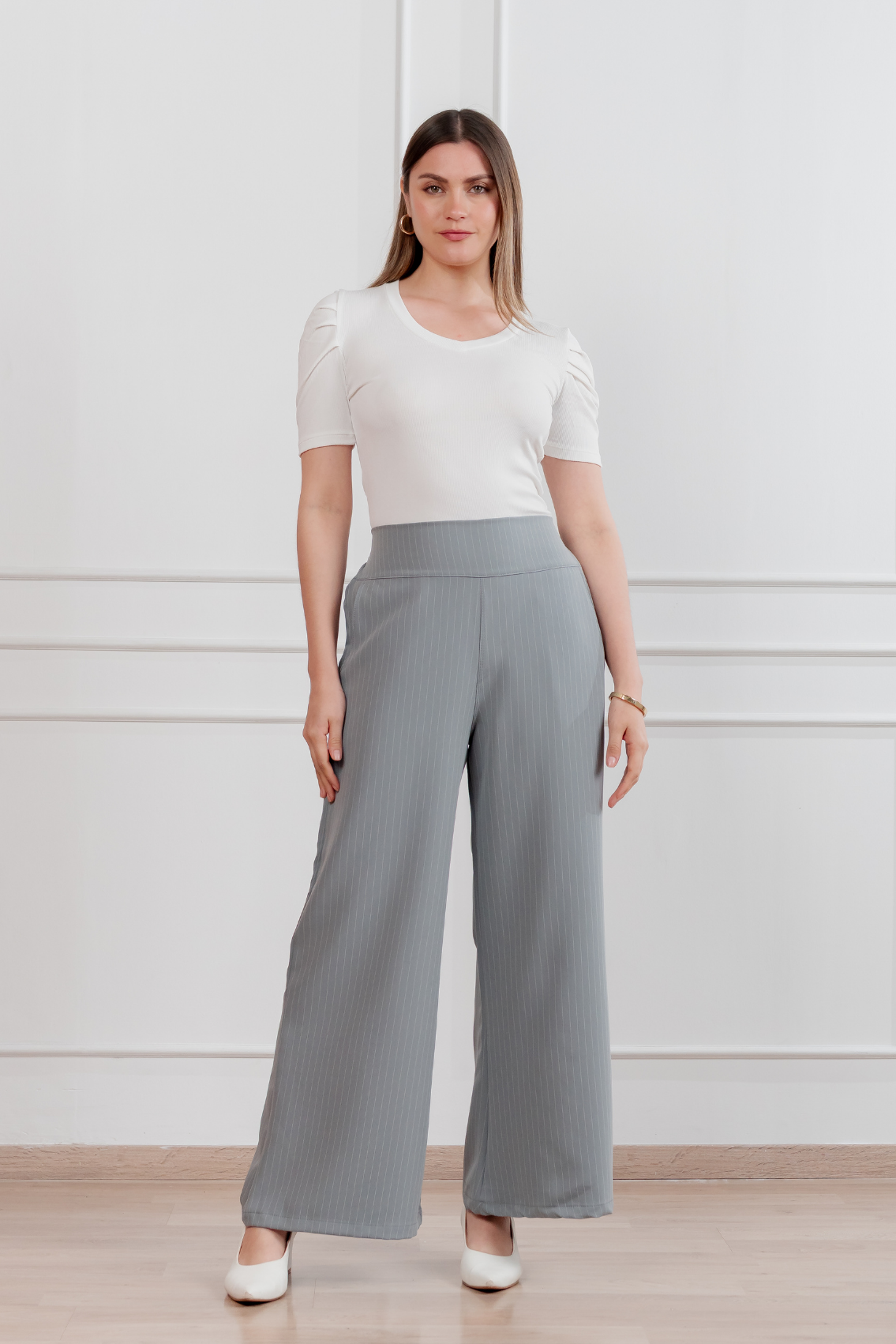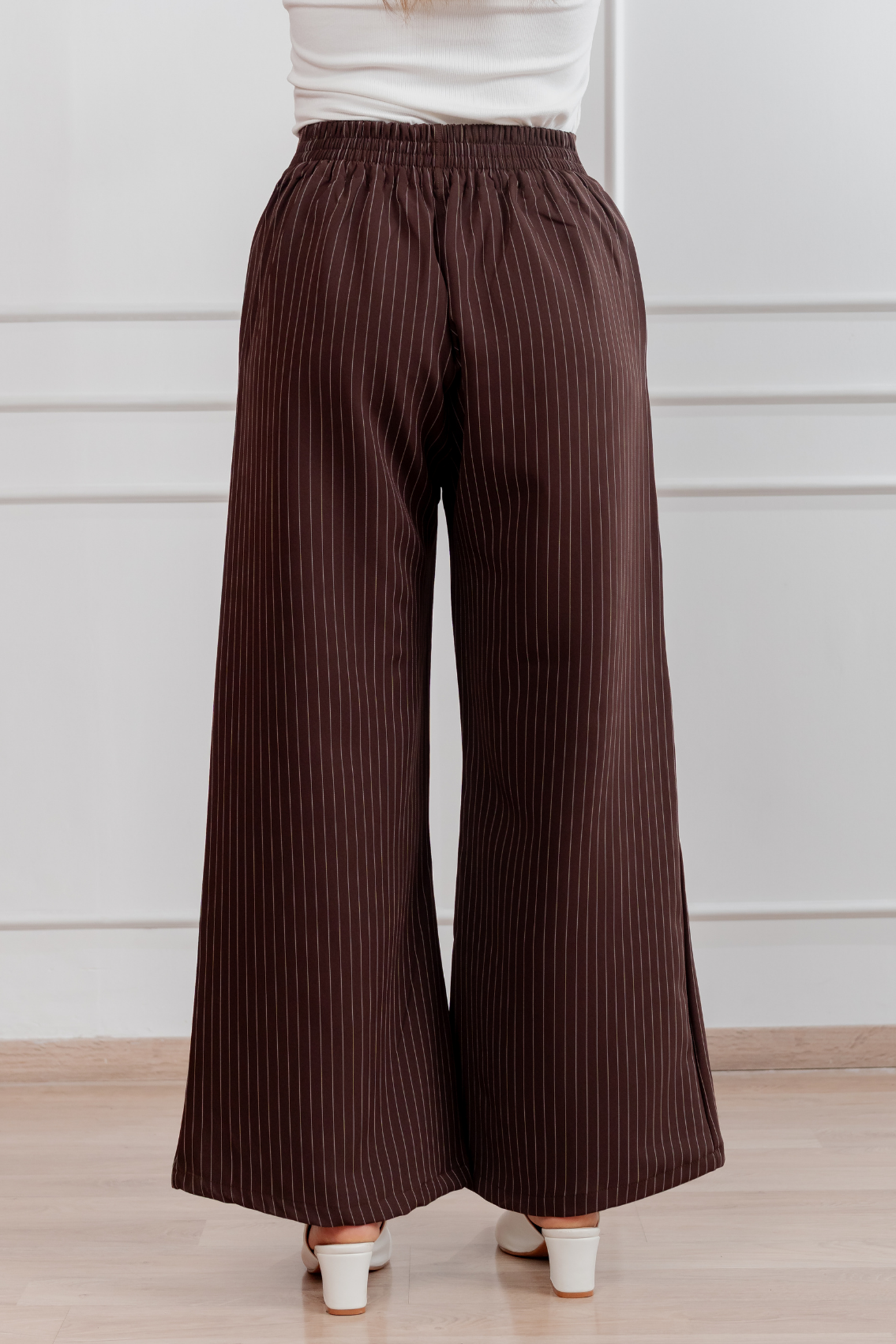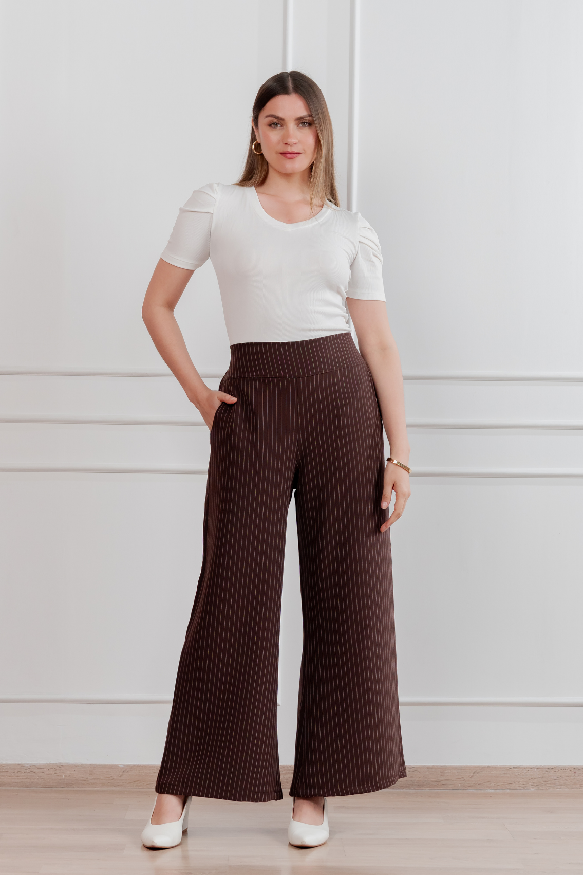 Pantalón palazzo de corte amplio con estampado de rayas verticales que estiliza visualmente la figura. Pretina alta para realzar la cintura y caída fluida para máxima comodidad y elegancia. Regular fit Tela:Catania con diseño de rayas Confección:100% peruana