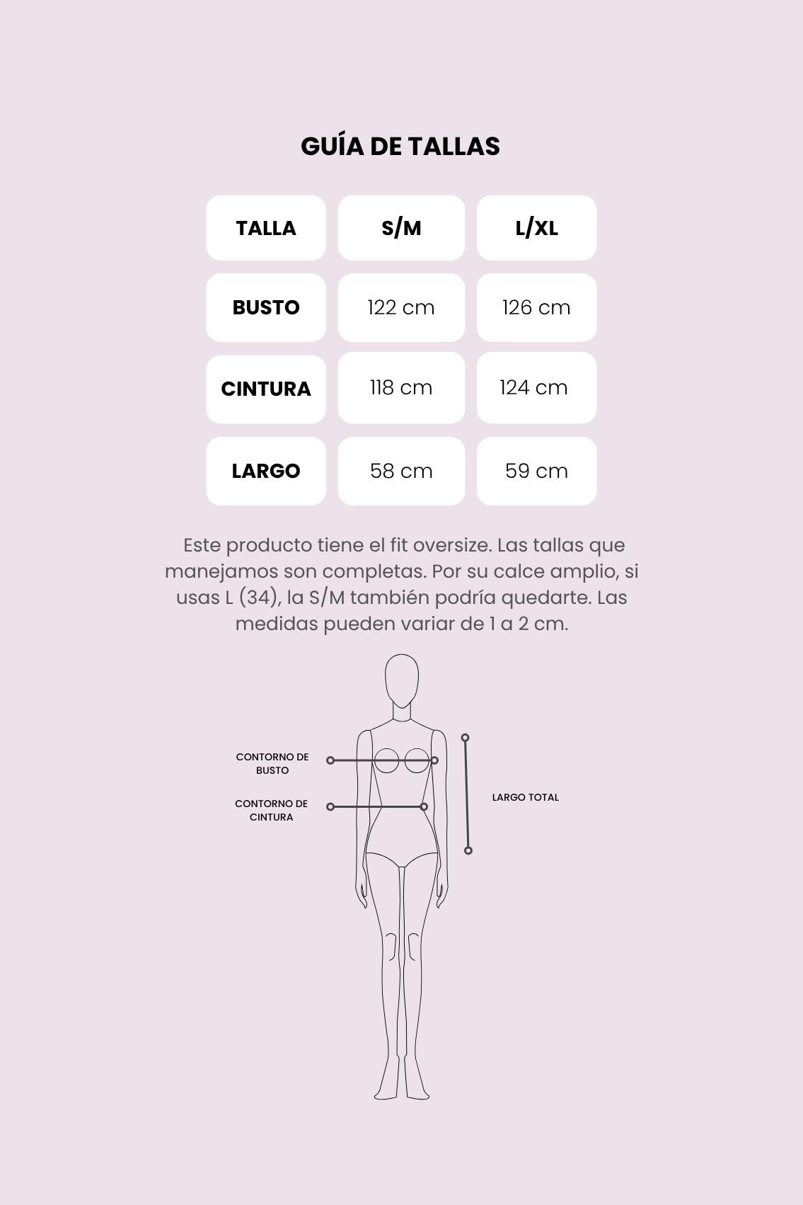 Cada producto cuenta con una tabla de medidas en formato de imagen, la cual encontrarás al final de la galería de fotos de cada producto. Además, en la descripción del producto detallamos las medidas, la altura de la modelo y la talla que utiliza, para que tengas una mejor referencia.