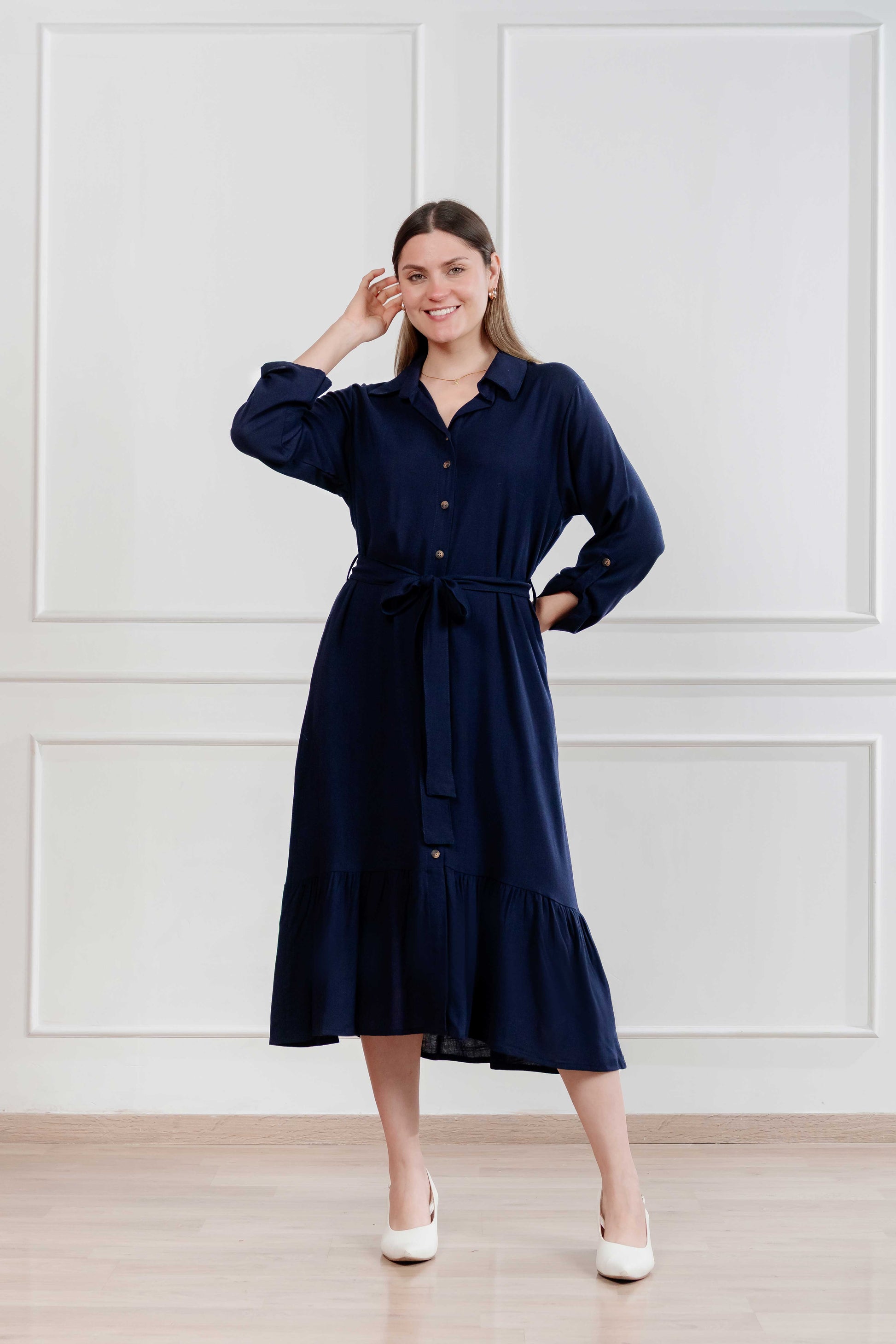 Un diseño clásico y versátil que combina elegancia y comodidad en una silueta camisera moderna. Su detalle de lazo en la cintura y falda con sutil vuelo aportan un acabado femenino y sofisticado. Perfecto para looks frescos y effortless.