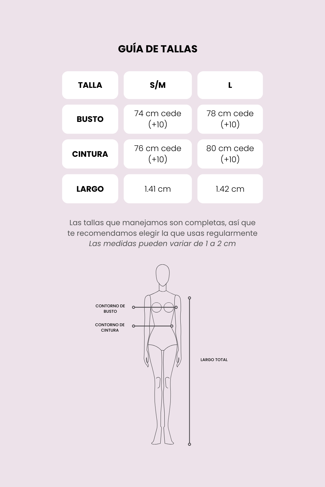 Cada producto cuenta con una tabla de medidas en formato de imagen, la cual encontrarás al final de la galería de fotos de cada producto. Además, en la descripción del producto detallamos las medidas, la altura de la modelo y la talla que utiliza, para que tengas una mejor referencia.