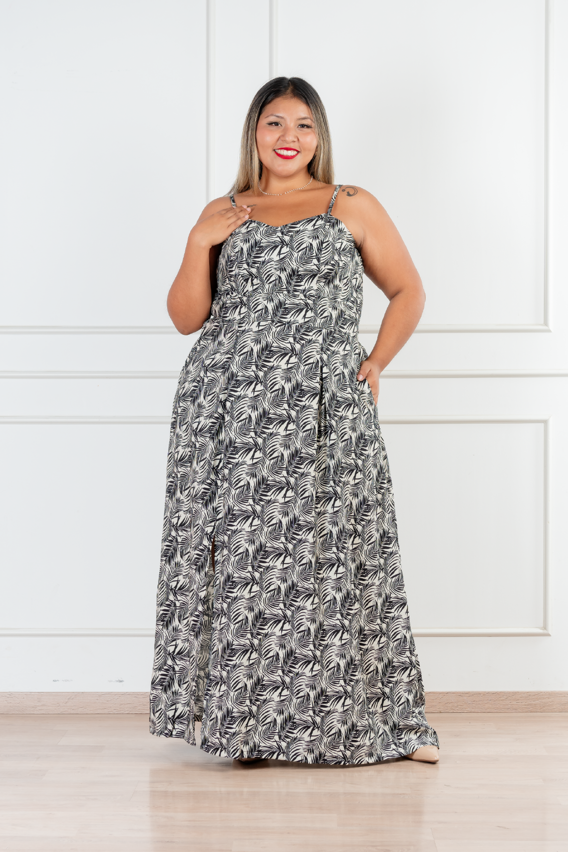 Un diseño femenino y versátil que resalta por su escote suave, tiras regulables y lazo frontal que permite ajustar la silueta. Su espalda elasticada brinda comodidad, mientras que la caída larga con abertura lateral aporta movimiento y un toque sofisticado.