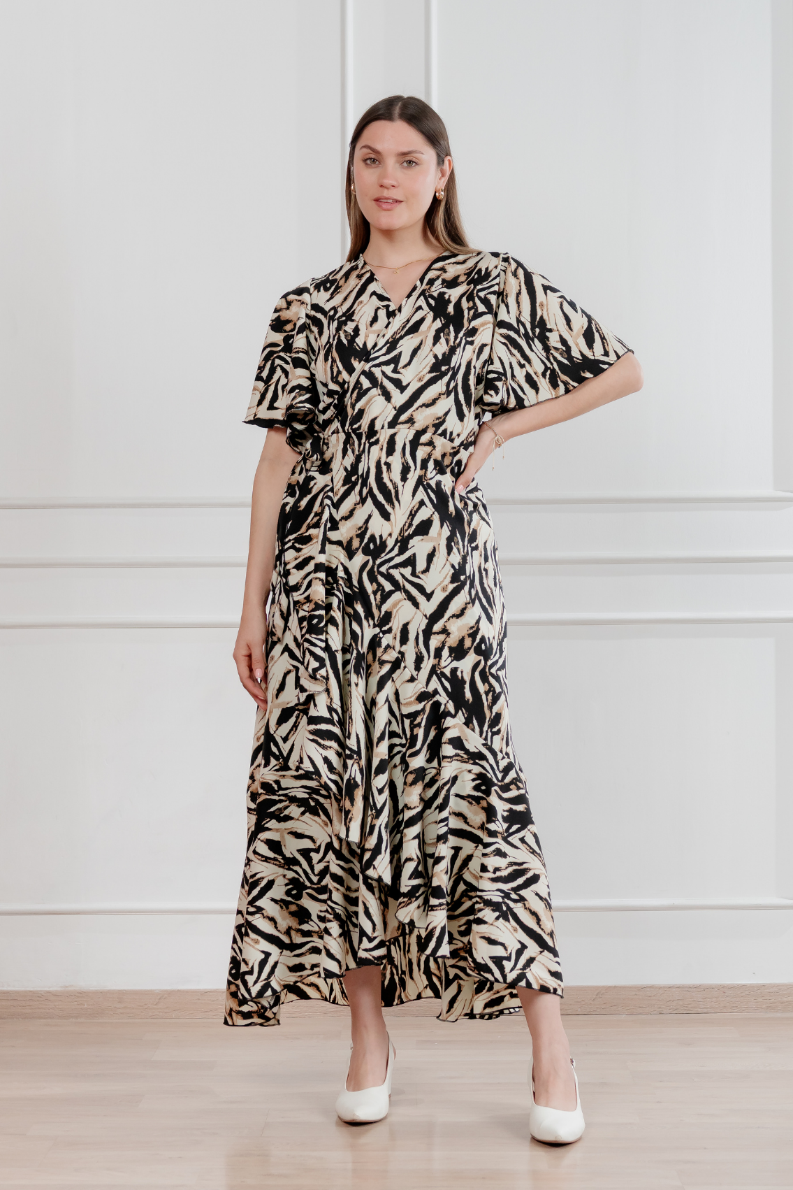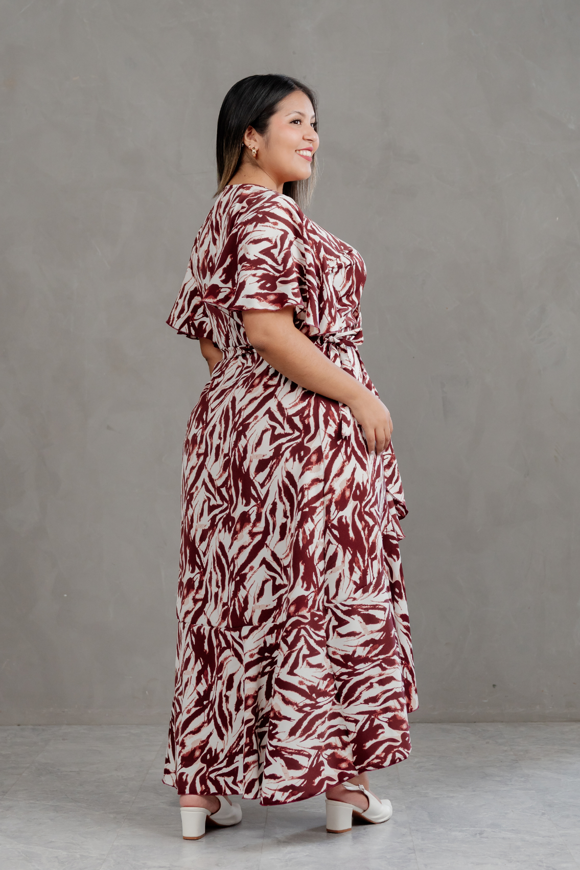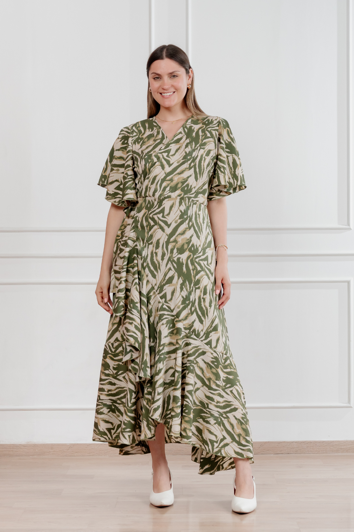 Un diseño suave y romántico que destaca por su silueta envolvente y delicado estampado floral. Sus mangas fluidas y caída asimétrica crean un movimiento elegante y femenino en cada paso. Una pieza perfecta para resaltar con sutileza y estilo.